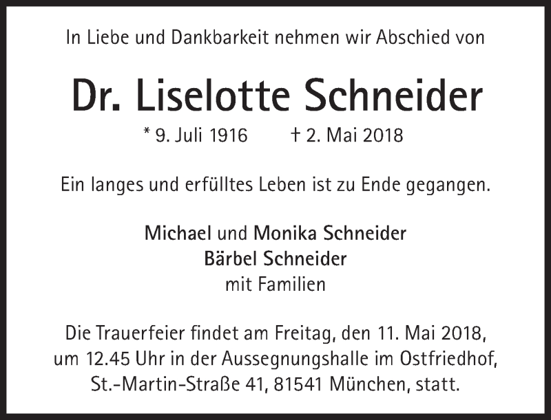Hier finden Sie alle Traueranzeigen aus der Zeitung, die bisher für Liselotte Schneider erschienen sind. Weitere Traueranzeigen, die in der Zeitung erscheinen, werden hier ebenfalls aufgelistet