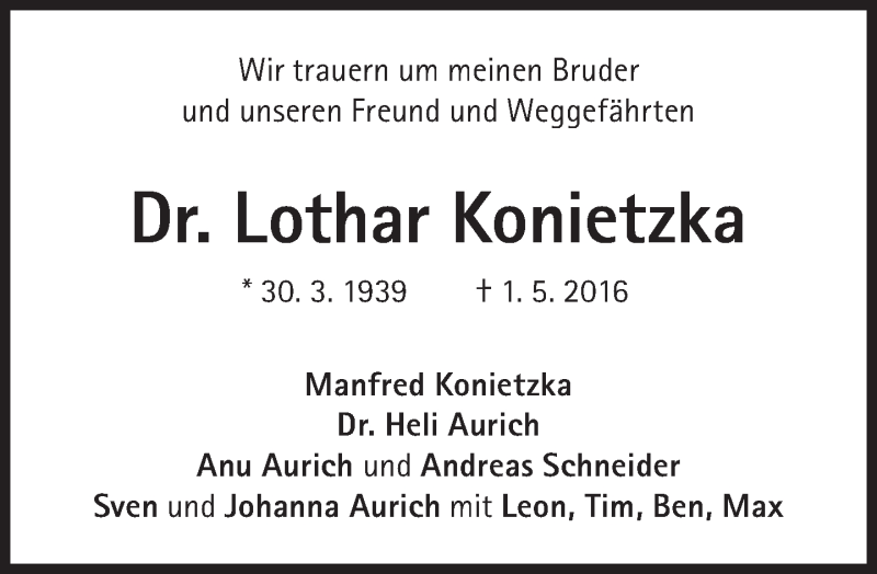 Hier finden Sie alle Traueranzeigen aus der Zeitung, die bisher für Lothar Konietzka erschienen sind. Weitere Traueranzeigen, die in der Zeitung erscheinen, werden hier ebenfalls aufgelistet