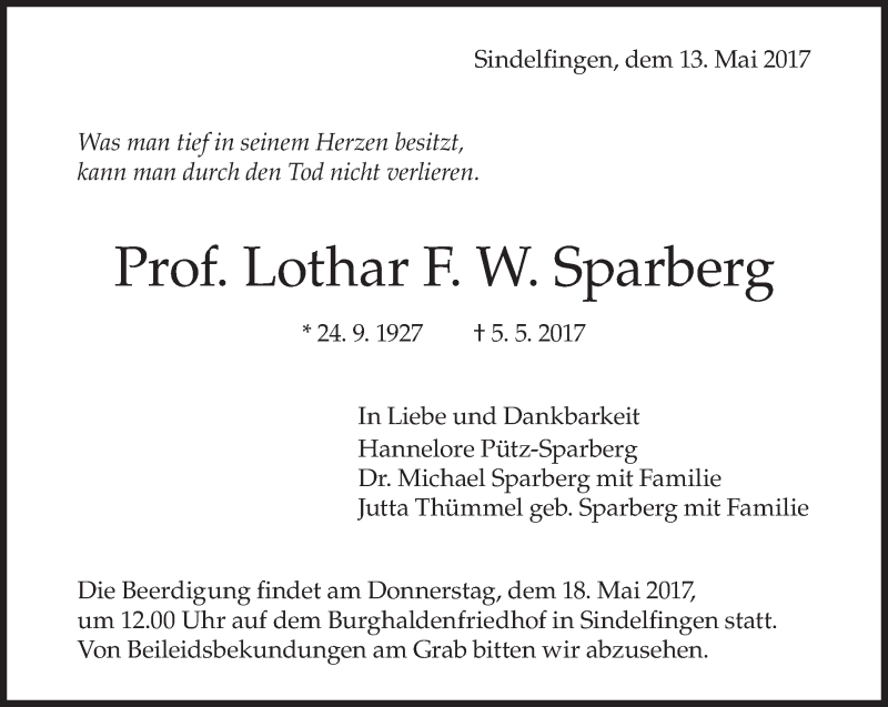 Hier finden Sie alle Traueranzeigen aus der Zeitung, die bisher für Lothar F. W. Sparberg erschienen sind. Weitere Traueranzeigen, die in der Zeitung erscheinen, werden hier ebenfalls aufgelistet