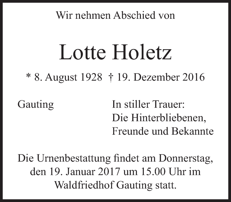 Hier finden Sie alle Traueranzeigen aus der Zeitung, die bisher für Lotte Holetz erschienen sind. Weitere Traueranzeigen, die in der Zeitung erscheinen, werden hier ebenfalls aufgelistet