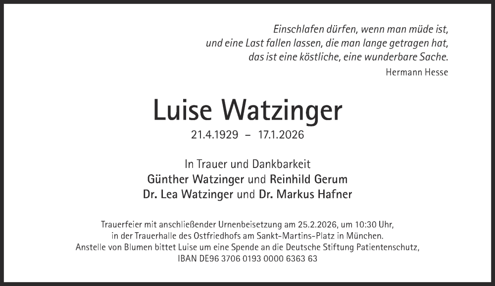 Hier finden Sie alle Traueranzeigen aus der Zeitung, die bisher für Luise Watzinger erschienen sind. Weitere Traueranzeigen, die in der Zeitung erscheinen, werden hier ebenfalls aufgelistet