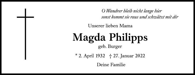 Hier finden Sie alle Traueranzeigen aus der Zeitung, die bisher für Magda Philipps erschienen sind. Weitere Traueranzeigen, die in der Zeitung erscheinen, werden hier ebenfalls aufgelistet