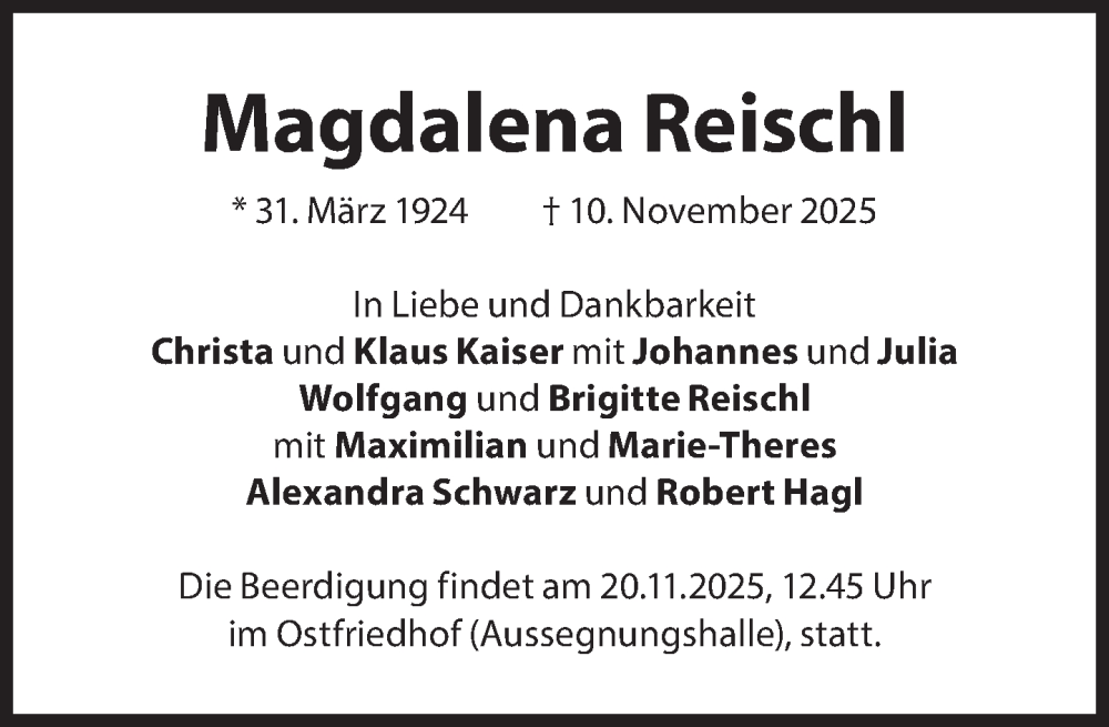 Hier finden Sie alle Traueranzeigen aus der Zeitung, die bisher für Magdalena Reischl erschienen sind. Weitere Traueranzeigen, die in der Zeitung erscheinen, werden hier ebenfalls aufgelistet