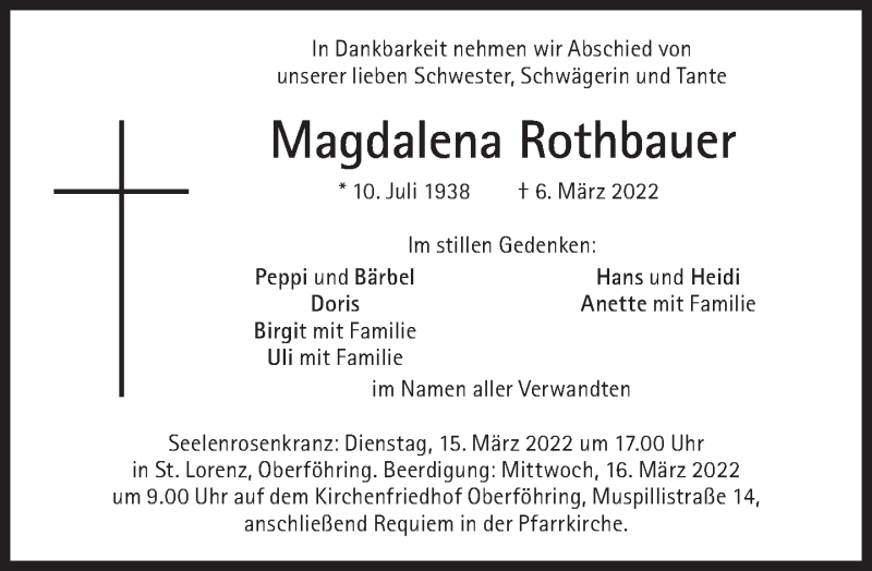 Hier finden Sie alle Traueranzeigen aus der Zeitung, die bisher für Magdalena Rothbauer erschienen sind. Weitere Traueranzeigen, die in der Zeitung erscheinen, werden hier ebenfalls aufgelistet