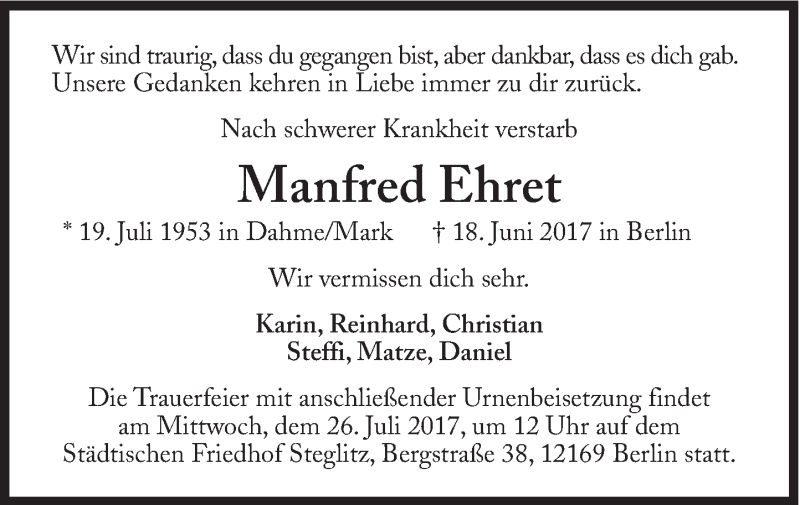 Hier finden Sie alle Traueranzeigen aus der Zeitung, die bisher für Manfred Ehret erschienen sind. Weitere Traueranzeigen, die in der Zeitung erscheinen, werden hier ebenfalls aufgelistet