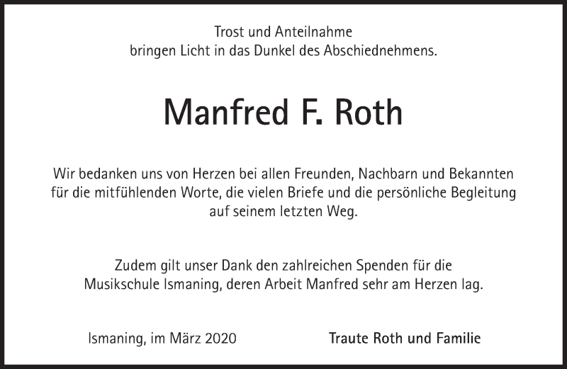 Hier finden Sie alle Traueranzeigen aus der Zeitung, die bisher für Manfred F. Roth erschienen sind. Weitere Traueranzeigen, die in der Zeitung erscheinen, werden hier ebenfalls aufgelistet