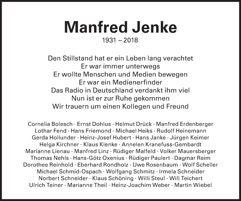 Hier finden Sie alle Traueranzeigen aus der Zeitung, die bisher für Manfred Jenke erschienen sind. Weitere Traueranzeigen, die in der Zeitung erscheinen, werden hier ebenfalls aufgelistet