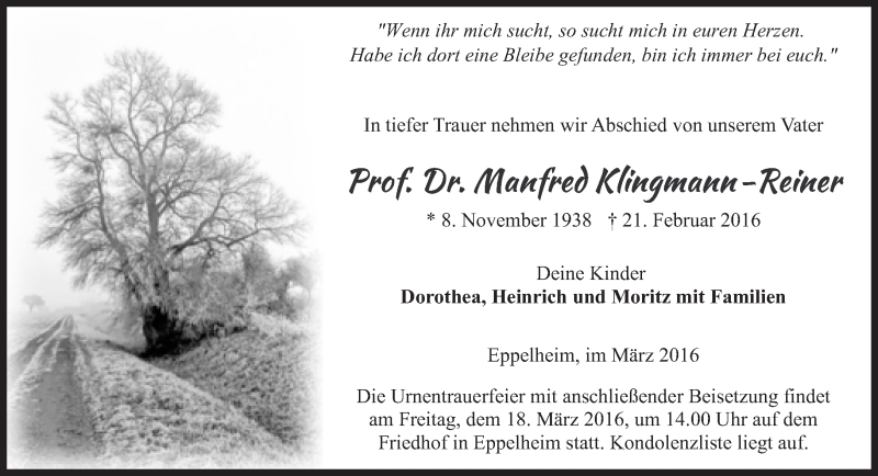 Hier finden Sie alle Traueranzeigen aus der Zeitung, die bisher für Manfred Klingmann-Reiner erschienen sind. Weitere Traueranzeigen, die in der Zeitung erscheinen, werden hier ebenfalls aufgelistet