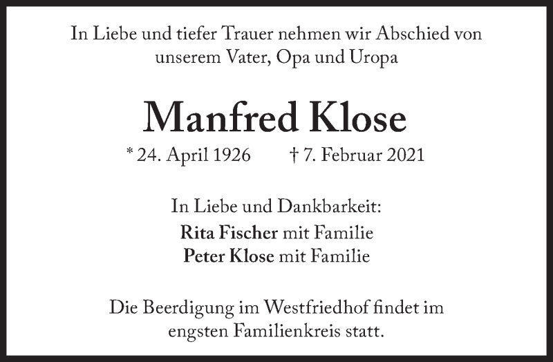 Hier finden Sie alle Traueranzeigen aus der Zeitung, die bisher für Manfred Klose erschienen sind. Weitere Traueranzeigen, die in der Zeitung erscheinen, werden hier ebenfalls aufgelistet