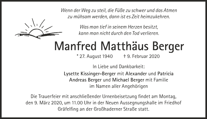 Hier finden Sie alle Traueranzeigen aus der Zeitung, die bisher für Manfred Matthäus Berger erschienen sind. Weitere Traueranzeigen, die in der Zeitung erscheinen, werden hier ebenfalls aufgelistet
