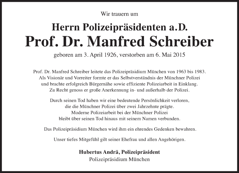 Hier finden Sie alle Traueranzeigen aus der Zeitung, die bisher für Manfred Schreiber erschienen sind. Weitere Traueranzeigen, die in der Zeitung erscheinen, werden hier ebenfalls aufgelistet