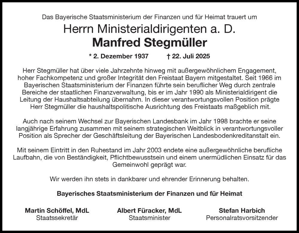 Hier finden Sie alle Traueranzeigen aus der Zeitung, die bisher für Manfred Stegmüller erschienen sind. Weitere Traueranzeigen, die in der Zeitung erscheinen, werden hier ebenfalls aufgelistet