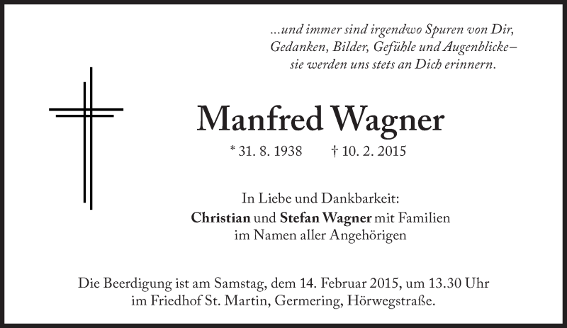 Hier finden Sie alle Traueranzeigen aus der Zeitung, die bisher für Manfred Wagner erschienen sind. Weitere Traueranzeigen, die in der Zeitung erscheinen, werden hier ebenfalls aufgelistet