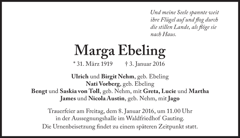 Hier finden Sie alle Traueranzeigen aus der Zeitung, die bisher für Marga Ebeling erschienen sind. Weitere Traueranzeigen, die in der Zeitung erscheinen, werden hier ebenfalls aufgelistet