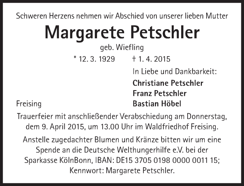 Hier finden Sie alle Traueranzeigen aus der Zeitung, die bisher für Margarete Petschler erschienen sind. Weitere Traueranzeigen, die in der Zeitung erscheinen, werden hier ebenfalls aufgelistet