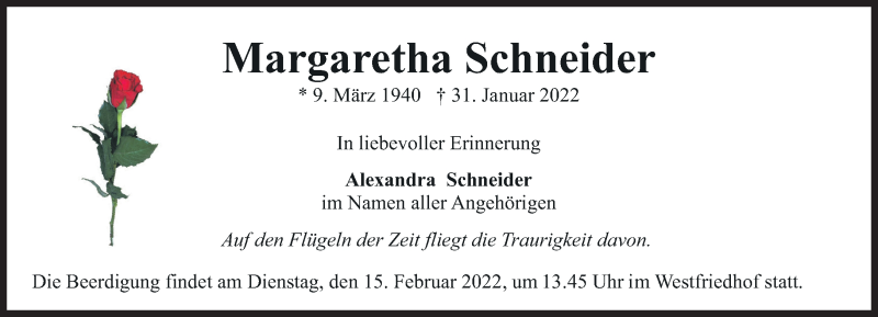 Hier finden Sie alle Traueranzeigen aus der Zeitung, die bisher für Margaretha Schneider erschienen sind. Weitere Traueranzeigen, die in der Zeitung erscheinen, werden hier ebenfalls aufgelistet