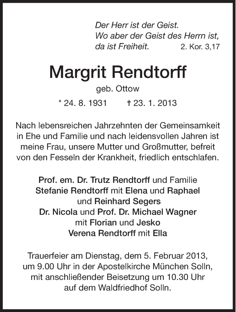 Hier finden Sie alle Traueranzeigen aus der Zeitung, die bisher für Margit Rendtorff erschienen sind. Weitere Traueranzeigen, die in der Zeitung erscheinen, werden hier ebenfalls aufgelistet