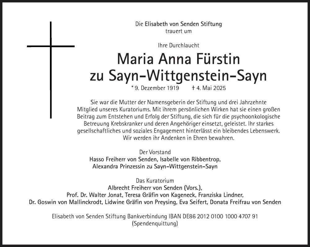 Hier finden Sie alle Traueranzeigen aus der Zeitung, die bisher für Maria Anna Fürstin zu Sayn-Wittgenstein-Sayn erschienen sind. Weitere Traueranzeigen, die in der Zeitung erscheinen, werden hier ebenfalls aufgelistet