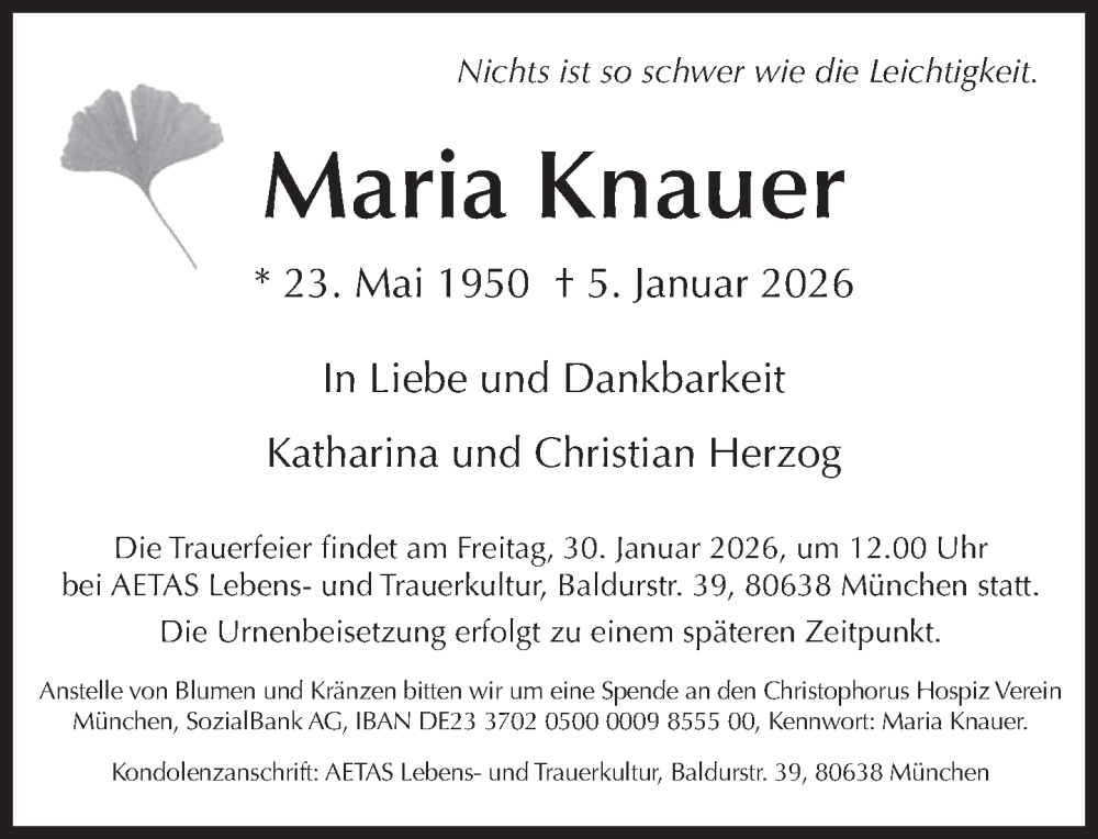 Hier finden Sie alle Traueranzeigen aus der Zeitung, die bisher für Maria Knauer erschienen sind. Weitere Traueranzeigen, die in der Zeitung erscheinen, werden hier ebenfalls aufgelistet