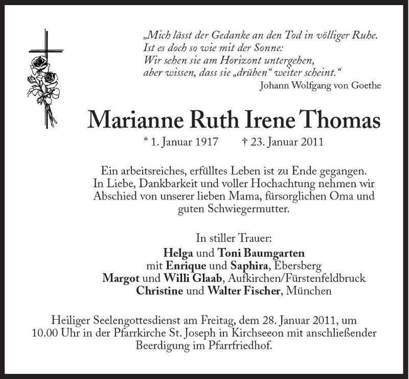 Hier finden Sie alle Traueranzeigen aus der Zeitung, die bisher für Marianne Ruth Irene Thomas erschienen sind. Weitere Traueranzeigen, die in der Zeitung erscheinen, werden hier ebenfalls aufgelistet
