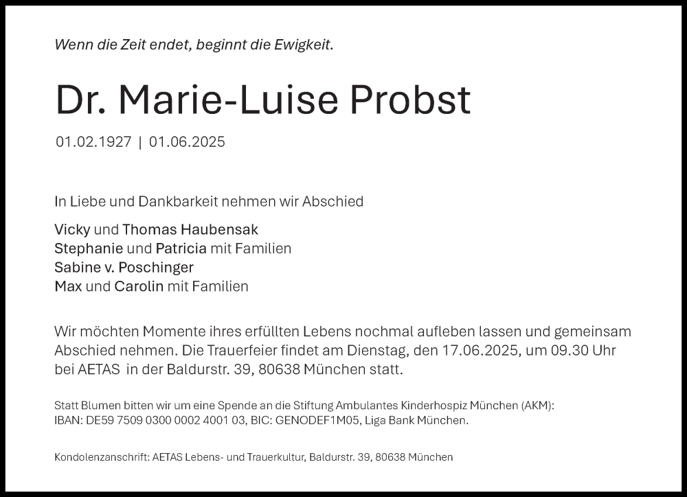 Hier finden Sie alle Traueranzeigen aus der Zeitung, die bisher für Marie-Luise Probst erschienen sind. Weitere Traueranzeigen, die in der Zeitung erscheinen, werden hier ebenfalls aufgelistet