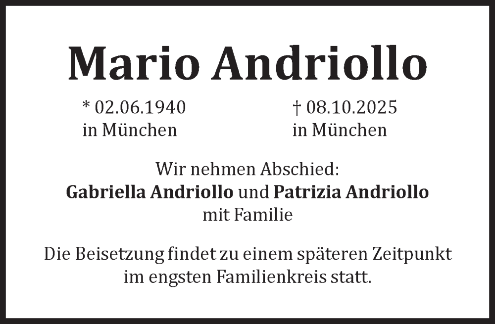 Hier finden Sie alle Traueranzeigen aus der Zeitung, die bisher für Mario Andriollo erschienen sind. Weitere Traueranzeigen, die in der Zeitung erscheinen, werden hier ebenfalls aufgelistet