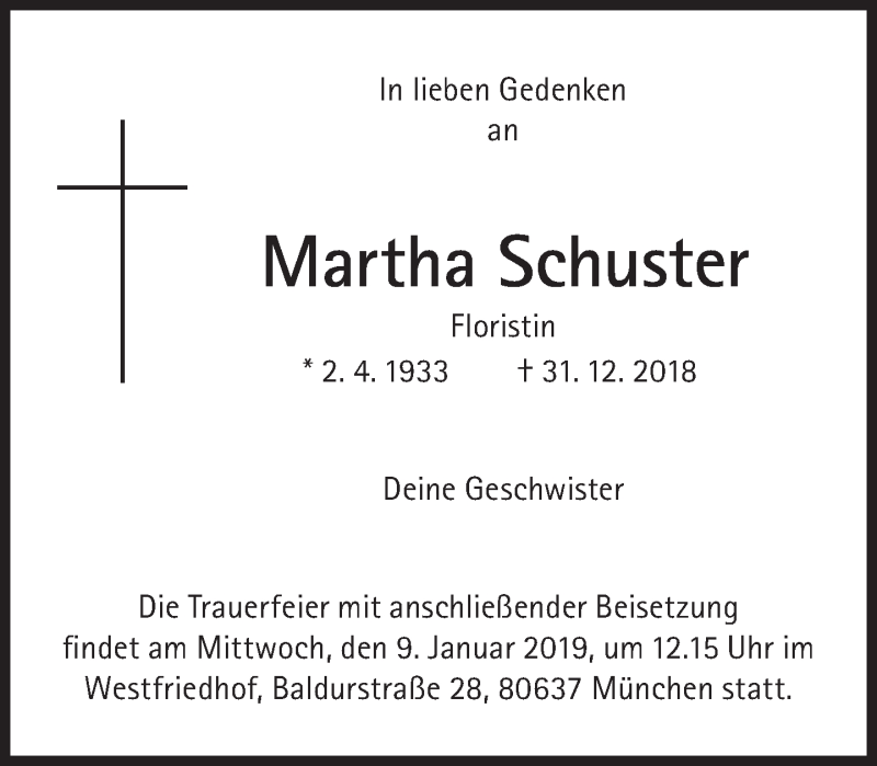 Hier finden Sie alle Traueranzeigen aus der Zeitung, die bisher für Martha Schuster erschienen sind. Weitere Traueranzeigen, die in der Zeitung erscheinen, werden hier ebenfalls aufgelistet