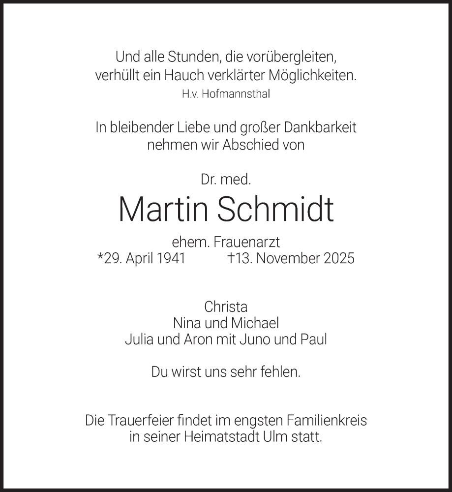 Hier finden Sie alle Traueranzeigen aus der Zeitung, die bisher für Martin Schmidt erschienen sind. Weitere Traueranzeigen, die in der Zeitung erscheinen, werden hier ebenfalls aufgelistet