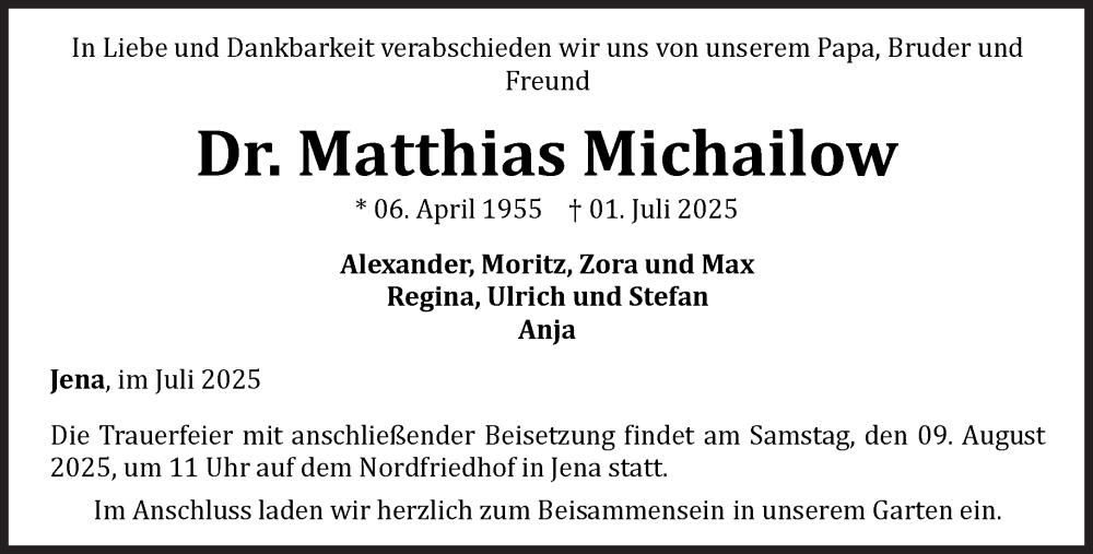 Hier finden Sie alle Traueranzeigen aus der Zeitung, die bisher für Matthias Michailow erschienen sind. Weitere Traueranzeigen, die in der Zeitung erscheinen, werden hier ebenfalls aufgelistet