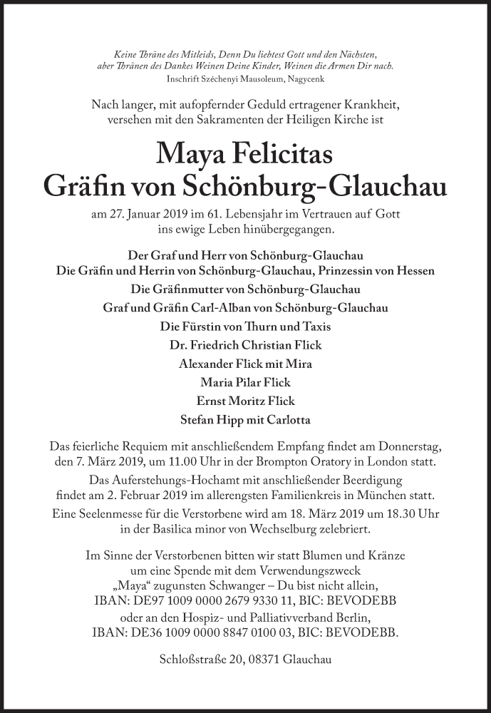 Hier finden Sie alle Traueranzeigen aus der Zeitung, die bisher für Maya Felicitas Gräfin von Schönburg-Glauchau erschienen sind. Weitere Traueranzeigen, die in der Zeitung erscheinen, werden hier ebenfalls aufgelistet