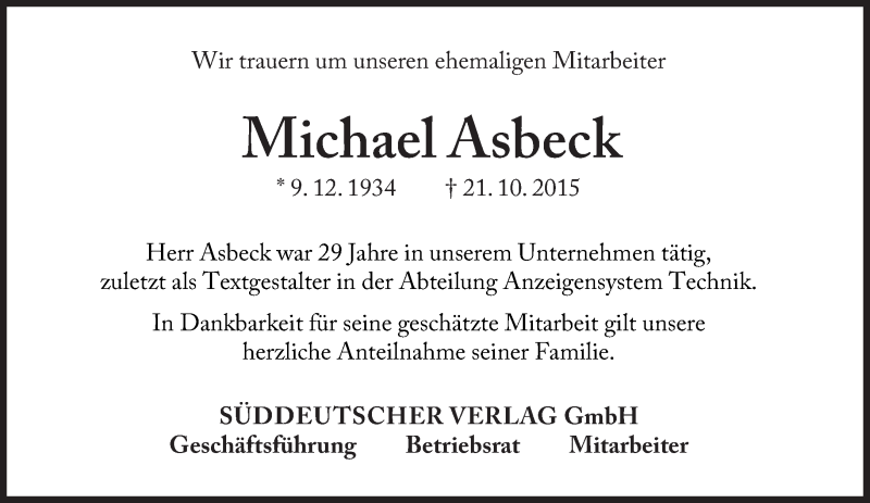Hier finden Sie alle Traueranzeigen aus der Zeitung, die bisher für Michael Asbeck erschienen sind. Weitere Traueranzeigen, die in der Zeitung erscheinen, werden hier ebenfalls aufgelistet