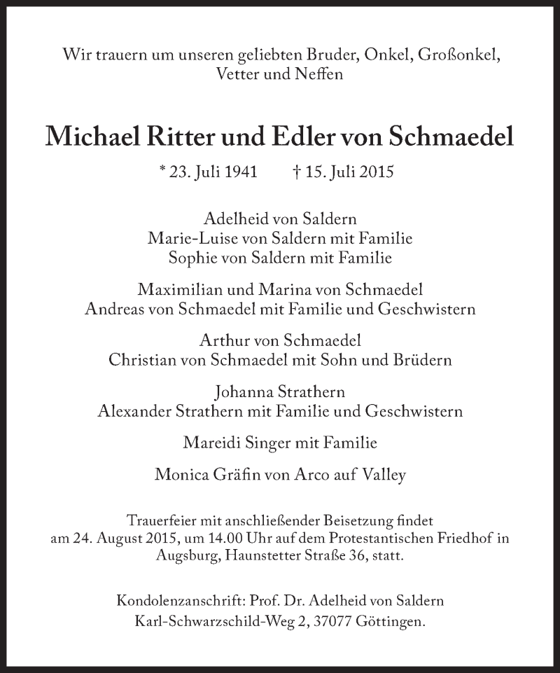 Hier finden Sie alle Traueranzeigen aus der Zeitung, die bisher für Michael Ritter und Edler von Schmaedel erschienen sind. Weitere Traueranzeigen, die in der Zeitung erscheinen, werden hier ebenfalls aufgelistet