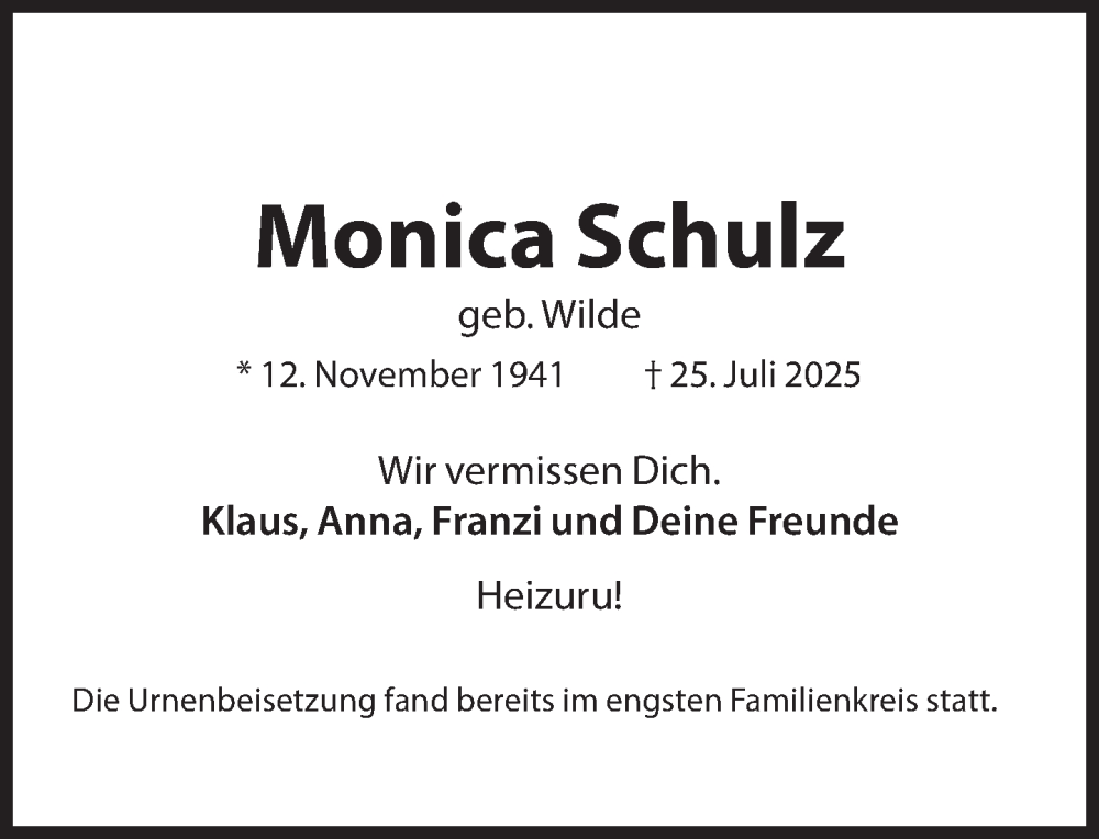 Hier finden Sie alle Traueranzeigen aus der Zeitung, die bisher für Monica Schulz erschienen sind. Weitere Traueranzeigen, die in der Zeitung erscheinen, werden hier ebenfalls aufgelistet