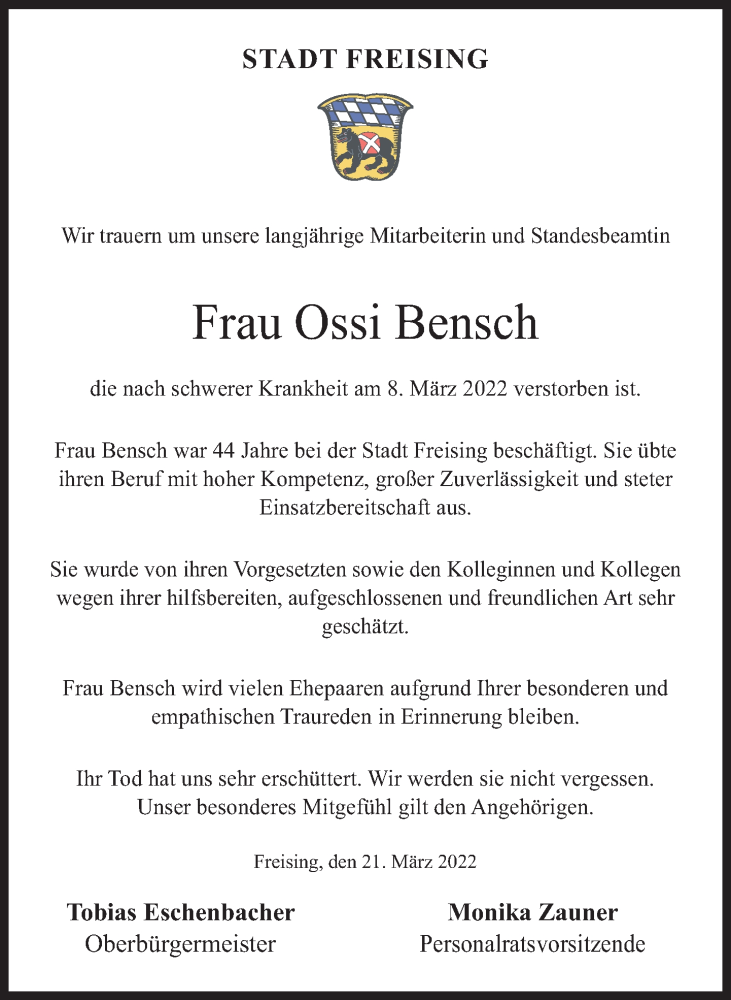 Hier finden Sie alle Traueranzeigen aus der Zeitung, die bisher für Ossi Bensch erschienen sind. Weitere Traueranzeigen, die in der Zeitung erscheinen, werden hier ebenfalls aufgelistet
