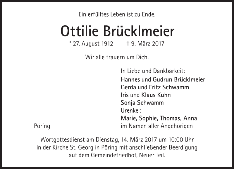 Hier finden Sie alle Traueranzeigen aus der Zeitung, die bisher für Ottilie Brücklmeier erschienen sind. Weitere Traueranzeigen, die in der Zeitung erscheinen, werden hier ebenfalls aufgelistet