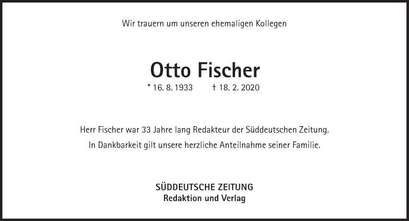 Hier finden Sie alle Traueranzeigen aus der Zeitung, die bisher für Otto Fischer erschienen sind. Weitere Traueranzeigen, die in der Zeitung erscheinen, werden hier ebenfalls aufgelistet