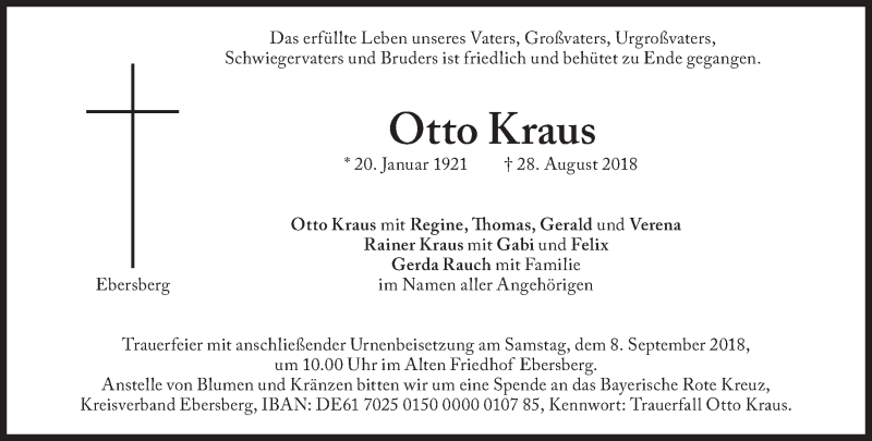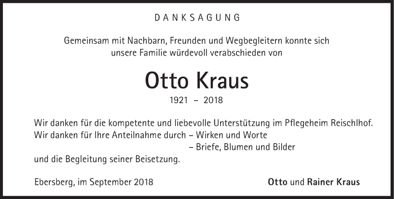 Hier finden Sie alle Traueranzeigen aus der Zeitung, die bisher für Otto Kraus erschienen sind. Weitere Traueranzeigen, die in der Zeitung erscheinen, werden hier ebenfalls aufgelistet