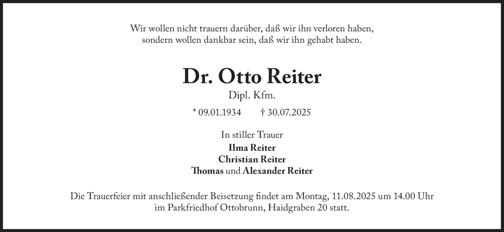 Hier finden Sie alle Traueranzeigen aus der Zeitung, die bisher für Otto Reiter erschienen sind. Weitere Traueranzeigen, die in der Zeitung erscheinen, werden hier ebenfalls aufgelistet