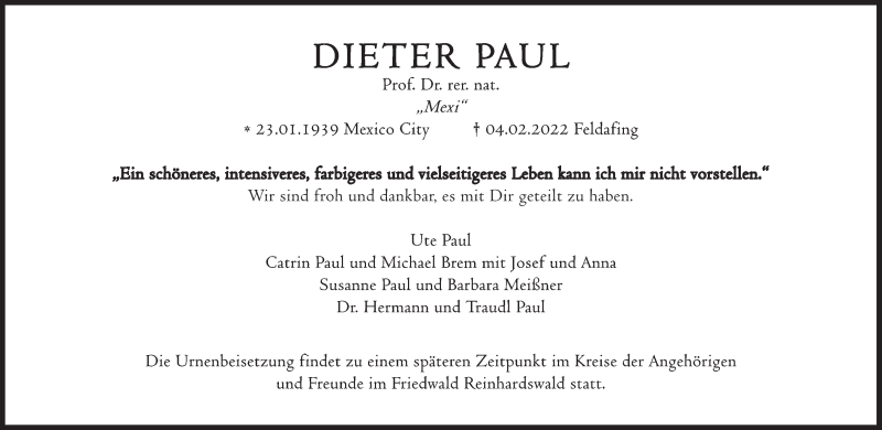 Hier finden Sie alle Traueranzeigen aus der Zeitung, die bisher für Paul Dietrich erschienen sind. Weitere Traueranzeigen, die in der Zeitung erscheinen, werden hier ebenfalls aufgelistet