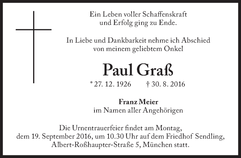 Hier finden Sie alle Traueranzeigen aus der Zeitung, die bisher für Paul Graß erschienen sind. Weitere Traueranzeigen, die in der Zeitung erscheinen, werden hier ebenfalls aufgelistet