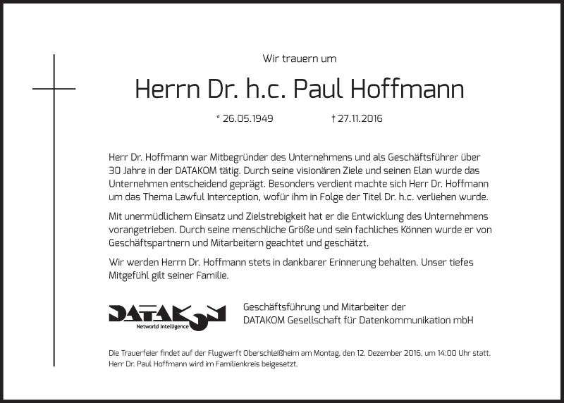 Hier finden Sie alle Traueranzeigen aus der Zeitung, die bisher für Paul Hoffmann erschienen sind. Weitere Traueranzeigen, die in der Zeitung erscheinen, werden hier ebenfalls aufgelistet