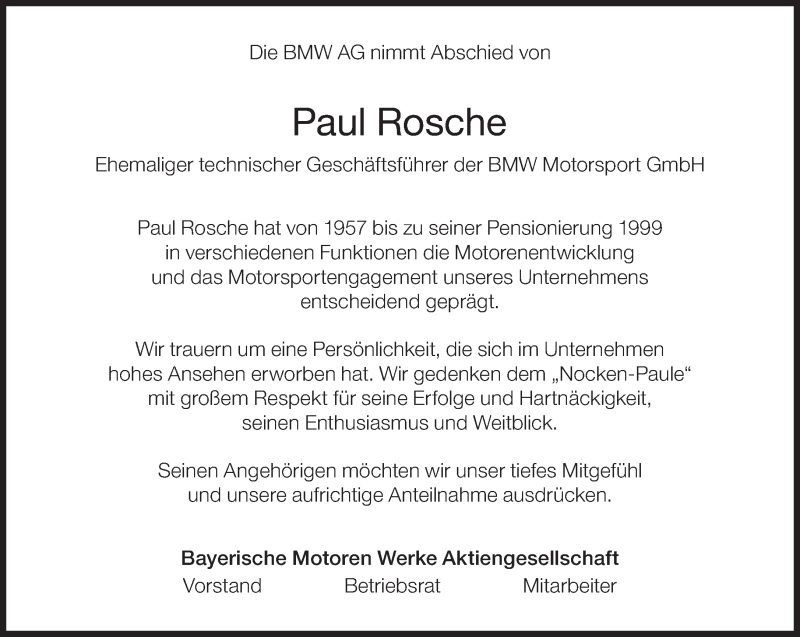Hier finden Sie alle Traueranzeigen aus der Zeitung, die bisher für Paul Rosche erschienen sind. Weitere Traueranzeigen, die in der Zeitung erscheinen, werden hier ebenfalls aufgelistet