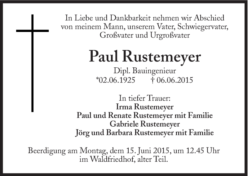Hier finden Sie alle Traueranzeigen aus der Zeitung, die bisher für Paul Rustemeyer erschienen sind. Weitere Traueranzeigen, die in der Zeitung erscheinen, werden hier ebenfalls aufgelistet