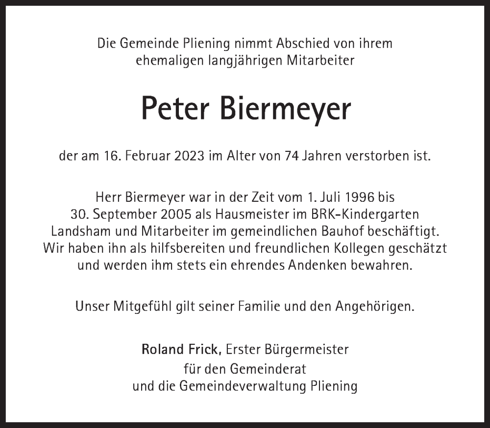 Hier finden Sie alle Traueranzeigen aus der Zeitung, die bisher für Peter Biermeyer erschienen sind. Weitere Traueranzeigen, die in der Zeitung erscheinen, werden hier ebenfalls aufgelistet