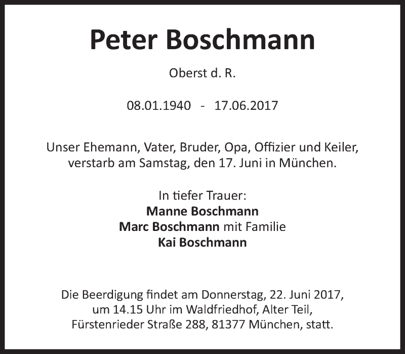 Hier finden Sie alle Traueranzeigen aus der Zeitung, die bisher für Peter Boschmann erschienen sind. Weitere Traueranzeigen, die in der Zeitung erscheinen, werden hier ebenfalls aufgelistet