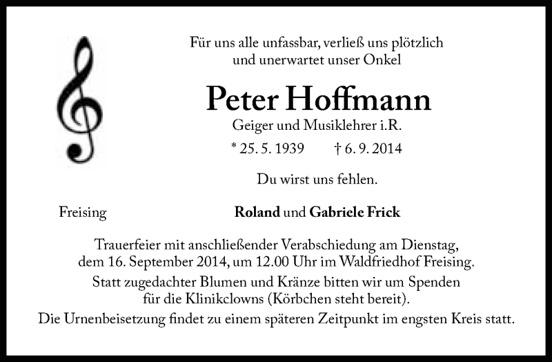 Hier finden Sie alle Traueranzeigen aus der Zeitung, die bisher für Peter Hoffrnann erschienen sind. Weitere Traueranzeigen, die in der Zeitung erscheinen, werden hier ebenfalls aufgelistet