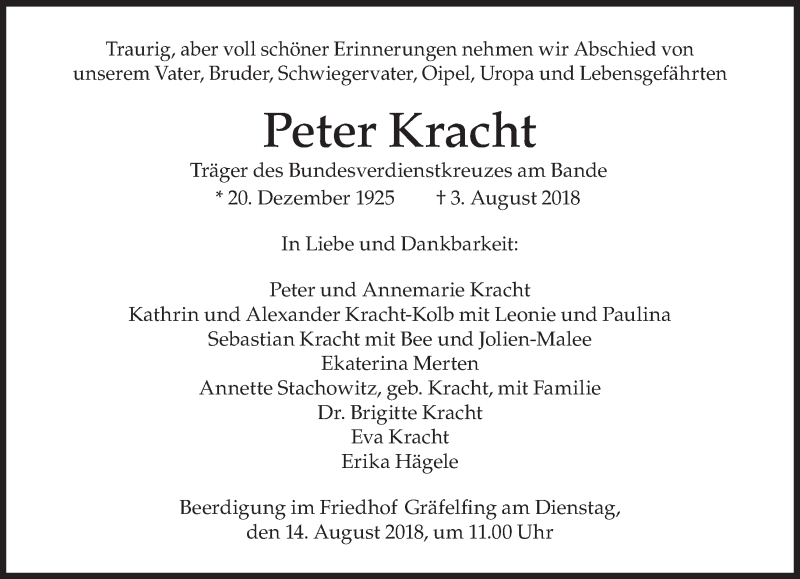 Hier finden Sie alle Traueranzeigen aus der Zeitung, die bisher für Peter Kracht erschienen sind. Weitere Traueranzeigen, die in der Zeitung erscheinen, werden hier ebenfalls aufgelistet