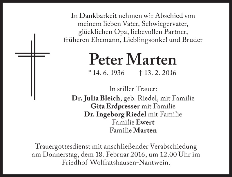 Hier finden Sie alle Traueranzeigen aus der Zeitung, die bisher für Peter Marten erschienen sind. Weitere Traueranzeigen, die in der Zeitung erscheinen, werden hier ebenfalls aufgelistet