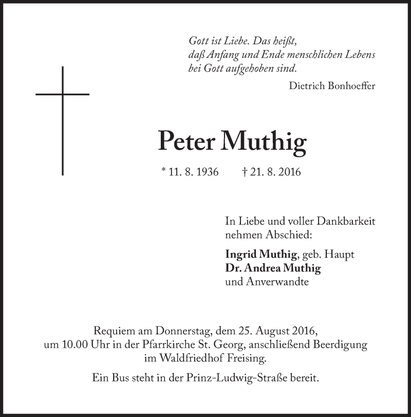 Hier finden Sie alle Traueranzeigen aus der Zeitung, die bisher für Peter Muthig erschienen sind. Weitere Traueranzeigen, die in der Zeitung erscheinen, werden hier ebenfalls aufgelistet