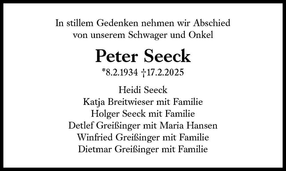 Hier finden Sie alle Traueranzeigen aus der Zeitung, die bisher für Peter Seeck erschienen sind. Weitere Traueranzeigen, die in der Zeitung erscheinen, werden hier ebenfalls aufgelistet